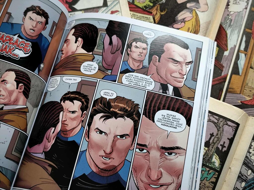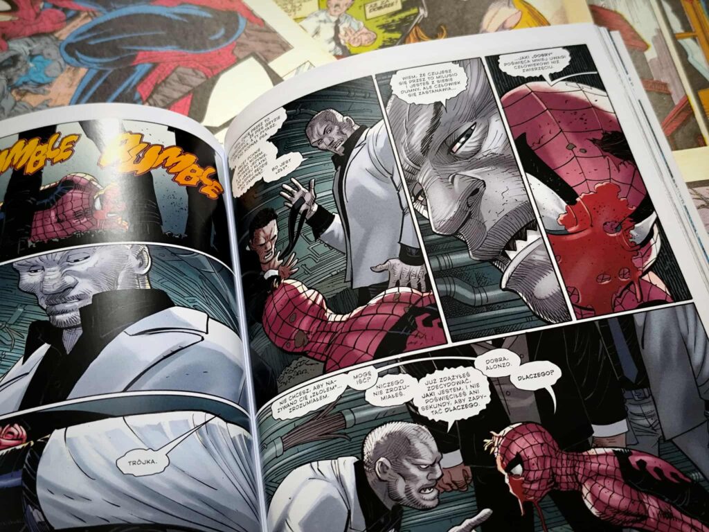 Pod względem fabularnym tom oferuje całkiem sporo, pojawia się wielu antagonistów, a ich motywacje są nakreślone na tyle wyraźnie, że nie sprawiają wrażenia jedynie przeszkód do pokonania. Pod koniec tomu na scenę wkracza postać, którą fani Marvela z pewnością kojarzą, chociażby z filmów i wszystko wskazuje na to, że odegra ona większą rolę w kolejnej części. Z przyjemniejszych elementów warto wspomnieć również o obecności Czarnej Kotki, która nie tylko wnosi oddech do mroczniejszego nastroju historii, ale też staje się ważnym punktem odniesienia dla emocjonalnego stanu Parkera.