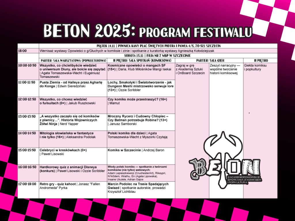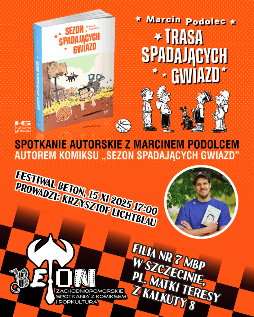 Szczecińskie spotkania z komiksem i popkulturą Beton 2025 to kolejna już edycja znanego i lubianego wydarzenia poświęconego kulturze popularnej ze szczególnym uwzględnieniem sztuki komiksowej. Impreza co roku wędruje w inne miejsca na mapie Szczecina. Tym razem główny trzon imprezy odbędzie się 15 listopada (sobota) w filii nr 7 Miejskiej Biblioteki Publicznej w Szczecinie, a dzień wcześniej, w Piwnicy Kany, odbędzie się wernisaż i spotkanie z kuratorką towarzyszącej mu wystawy.