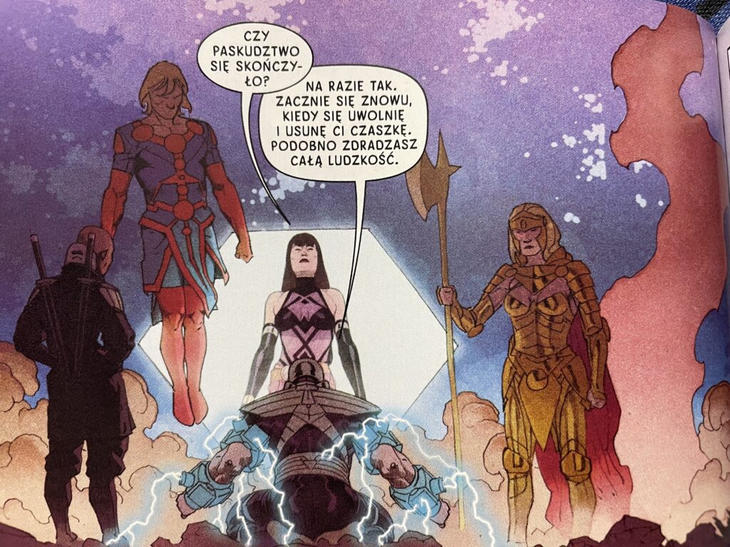 Choć w komiksie nie brakuje widowiskowych walk, podróży między wymiarami czy pojawienia się tak potężnych postaci jak Thanos, to nie spektakl wizualny jest tu najważniejszy. Gillen skupia się na bohaterach. Na ich lojalnościach, zdradach, wątpliwościach i słabościach. Dzięki temu Przedwieczni nie jawią się jako boskie automaty, lecz istoty, które mimo swej nieśmiertelności noszą w sobie ciężar win i pytania o sens istnienia. To sprawia, że lektura nabiera emocjonalnej głębi i unika typowych dla superbohaterskich opowieści uproszczeń.