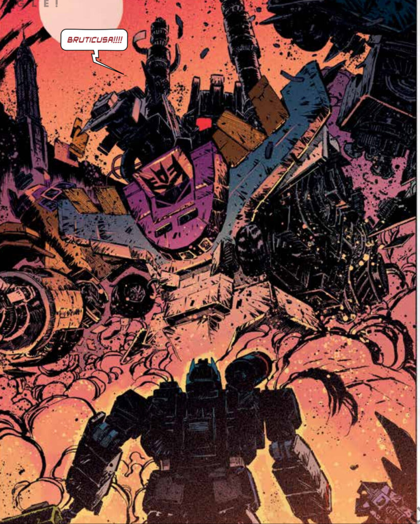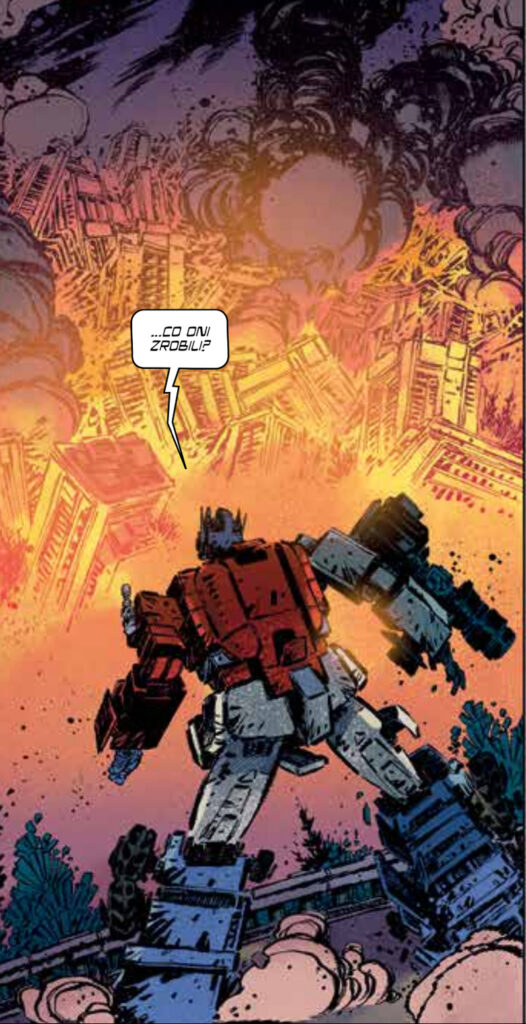 Jednym z najmocniejszych elementów tomu są rysunki Jorge Corony. Jego styl doskonale oddaje zarówno skalę spektakularnych bitew, jak i ciężar emocjonalny konfliktu. Plansze są dynamiczne, brutalne i pełne szczegółów. Widać każde pęknięcie pancerza, każdy ślad po strzałach. Szczególnie efektowne są sceny z udziałem Combinerów, gigantycznych robotów powstałych z połączenia mniejszych jednostek. Ich walka w centrum miasta to prawdziwy pokaz destrukcji w skali, jakiej seria jeszcze nie widziała. Mike Spicer dodaje do tego odpowiedni klimat kolorystyczny. Zastosowana paleta barw zmienia się zależnie od miejsca akcji, podkreślając nastrój scen.