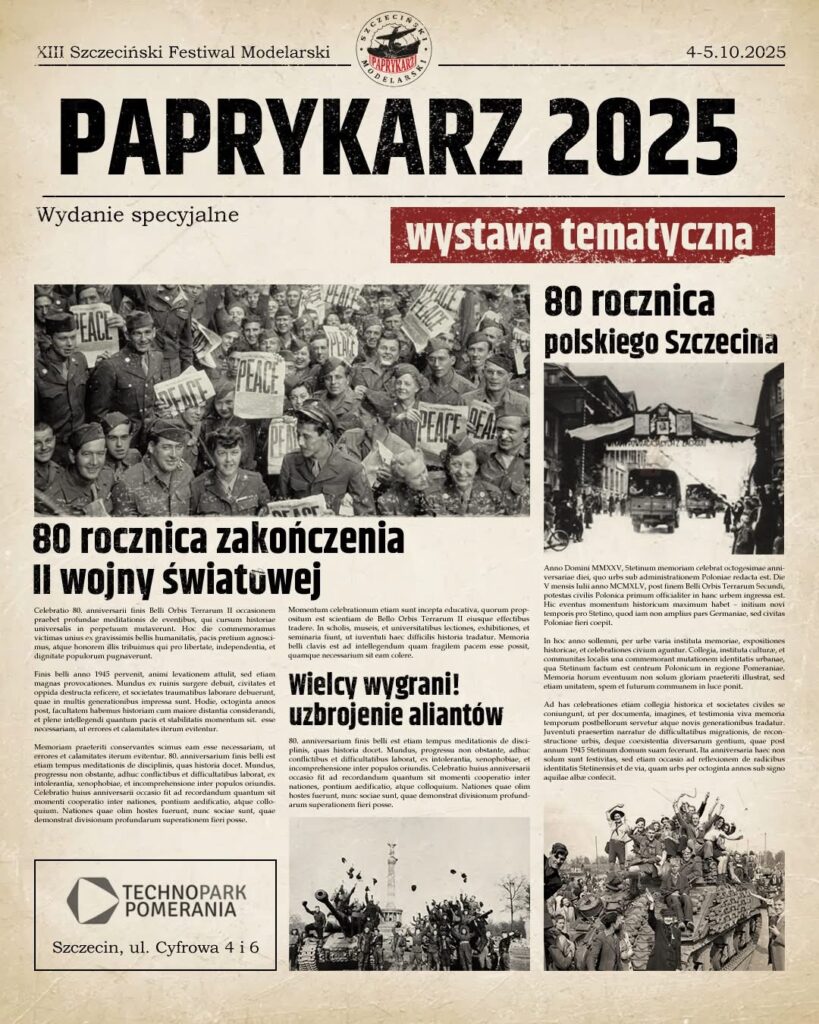 Szczecin znów zamienia się w stolicę modelarstwa — już po raz trzynasty organizatorzy zapraszają na Paprykarz: dwa dni pełne miniatur, precyzji i spotkań pasjonatów. W programie znajdą się wystawy setek modeli plastikowych i kartonowych, giełda modelarska, pokazy grup rekonstrukcyjnych, warsztaty oraz konkursy dla zawodników w różnorodnych klasach wiekowych i tematycznych.